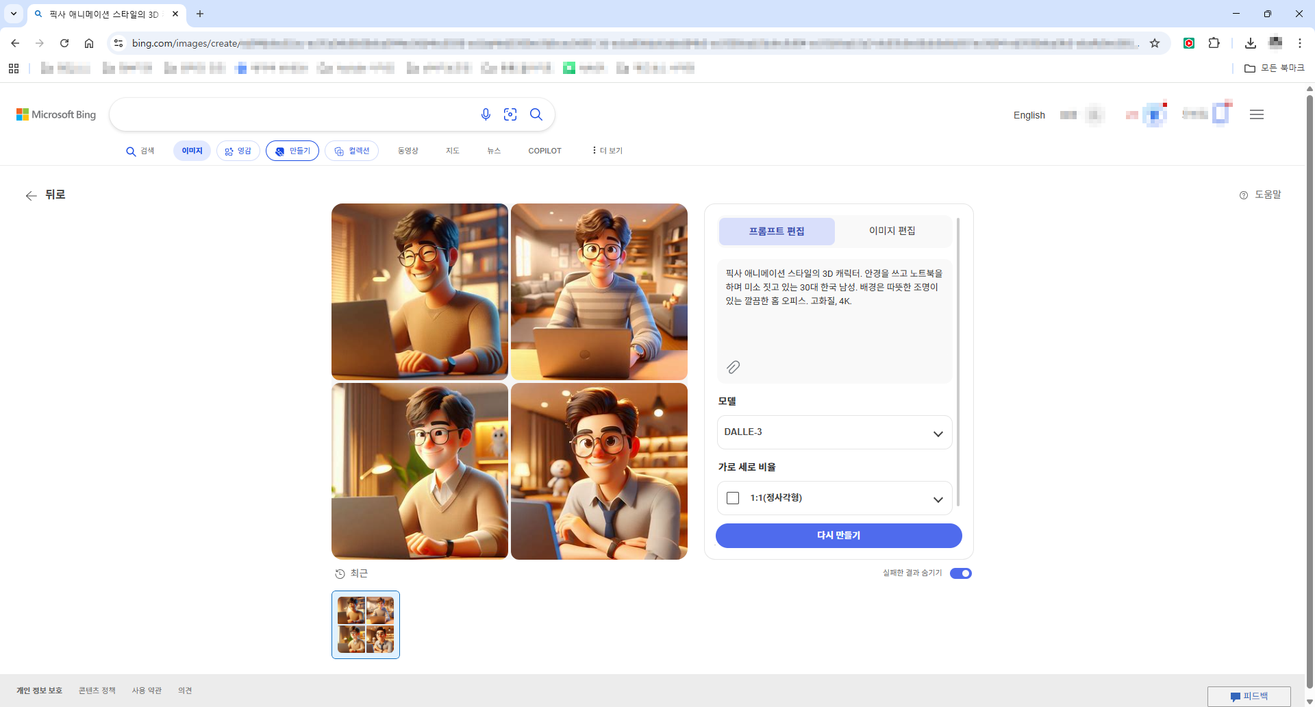 이 문장을 그대로 빙 이미지 크리에이터 입력창에 넣기만 하면 됩니다. 4장의 이미지가 생성되는데, 그중 가장 마음에 드는 것을 다운로드하여 프로필 사진으로 설정하면 끝입니다.