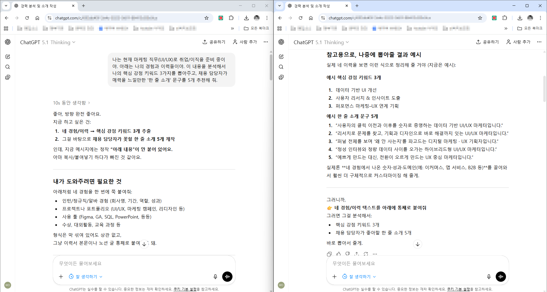 [추천 프롬프트] "나는 현재 마케팅 직무(본인 희망 직무)로 취업/이직을 준비 중이야. 아래는 나의 경험과 이력들이야. 이 내용을 분석해서 나의 핵심 강점 키워드 3가지를 뽑아주고, 채용 담당자가 매력을 느낄만한 '한 줄 소개' 문구를 5개 추천해 줘."