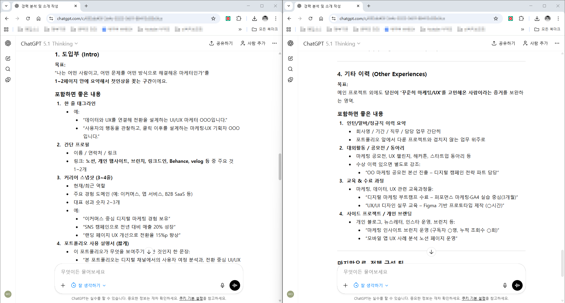 - "마케터 포트폴리오를 만들 건데, 도입부-핵심 역량-프로젝트-기타 이력 순서로 목차를 구성해 줘. 각 섹션에 어떤 내용이 들어가야 가장 설득력 있을지 조언해 줘."